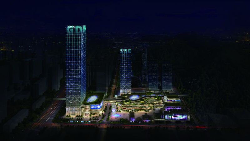 项目办公用楼总高292米,有建筑挑檐的图案,灵感来自钻石的形状,象征着星光闪烁的夜晚照亮了天空。