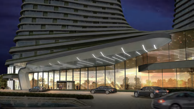 武汉光谷金融中心总建筑面积约16.8万平方米,建设主体为联体双塔楼,高22层。设计考虑了湖光山色和历史积淀,提取了“龙脊梯田”这一民族元素,体现了人文与商业的融合。