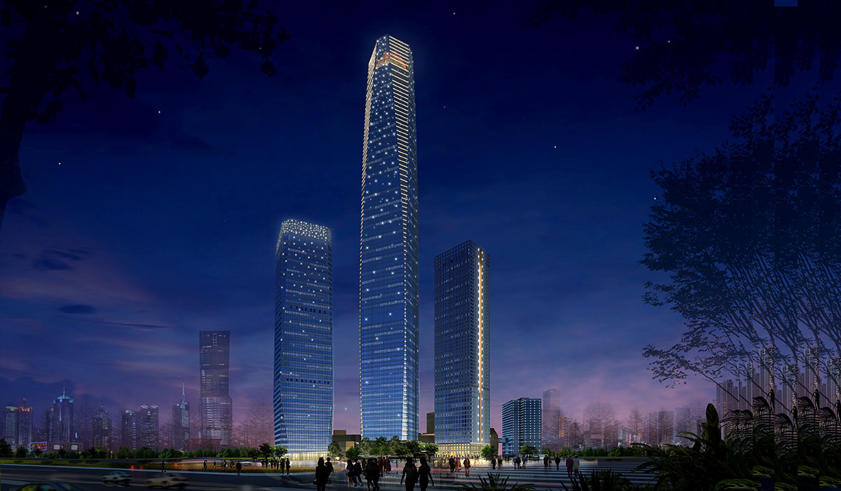 项目位于东莞市中心地带,包括5栋塔楼和1个大型商业裙楼,其中2号塔楼建筑高度为428米,泛光照明效果丰富生动,磅礴大气。