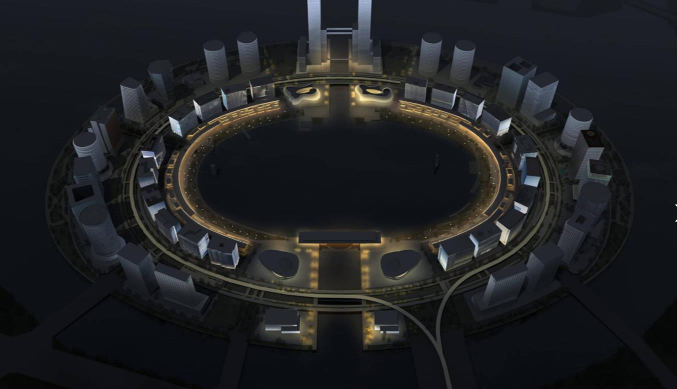 项目位于郑东新区副CBD湖心岛,运用了明度较高的白色灯光,勾 勒出建筑整体轮廓,打造商务现代感。