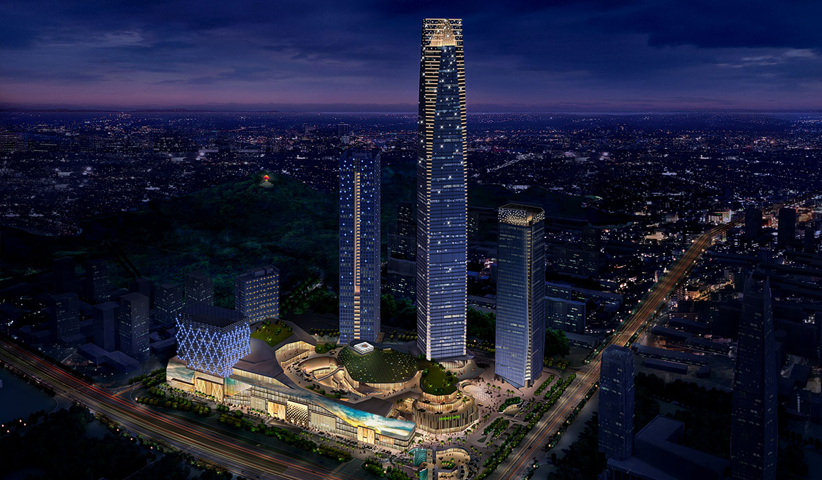 项目位于东莞市中心地带,包括5栋塔楼和1个大型商业裙楼,其中2号塔楼建筑高度为428米,泛光照明效果丰富生动,磅礴大气。